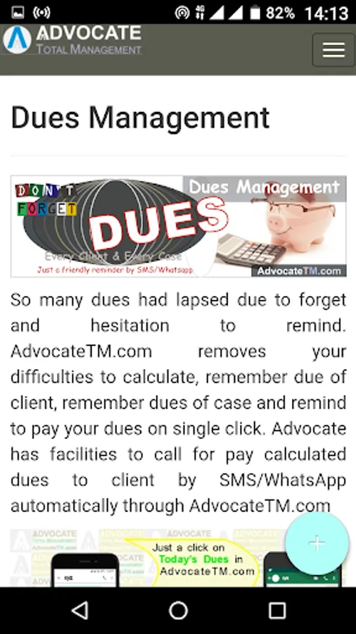 So many dues had lapsed due to forget dues and hesitation to remind. AdvocateTM removes your difficulties to calculate, remember due of client, remember dues of case and remind to pay your dues on single click. Advocate has facilities to call for pay calculated dues to client by SMS/Whatsapp