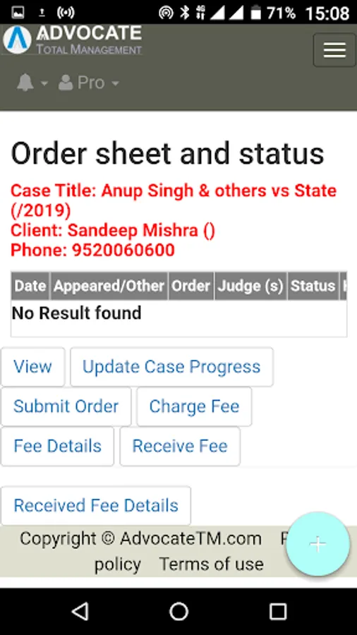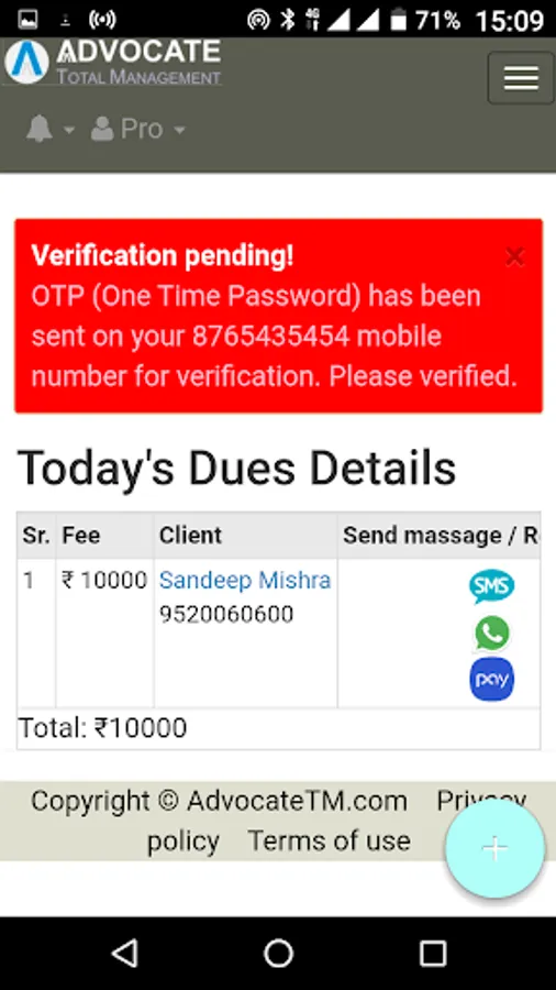 Now AdvocateTM provides SMS & whatsapp message to your client on update of order, fee, dues etc..