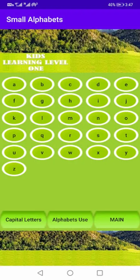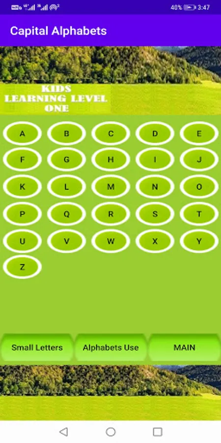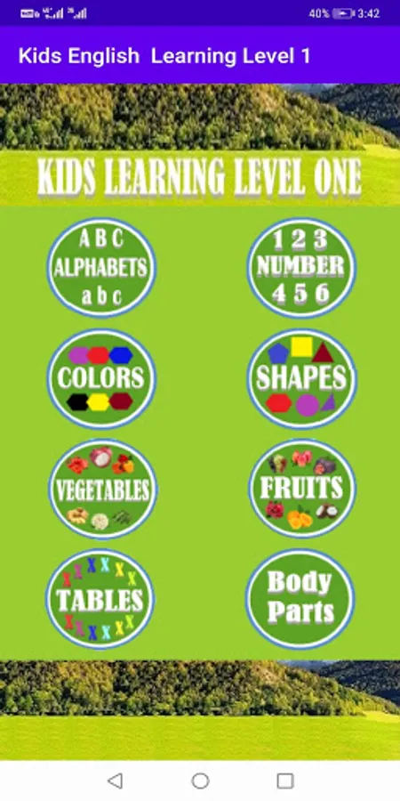 This is English learning app, learning of Small Alphabets, Capital Alphabets, use of Alphabets, numbers from 1 to 100, shapes & colors all these with sounds. Best educational app for kids to learn alphabet, numbers, shapes, coloring & so more.....
