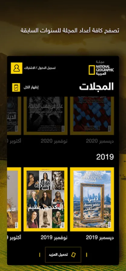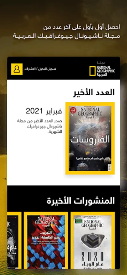 In the first edition of the Arab National Geographic magazine application, the user will be able to see the latest issues related to geographical facts full of science and facts around the world, in addition to presenting the most delicious cognitive dishes to the Arab reader hungry to discover the secrets of the planet Earth by browsing the magazine's issues.