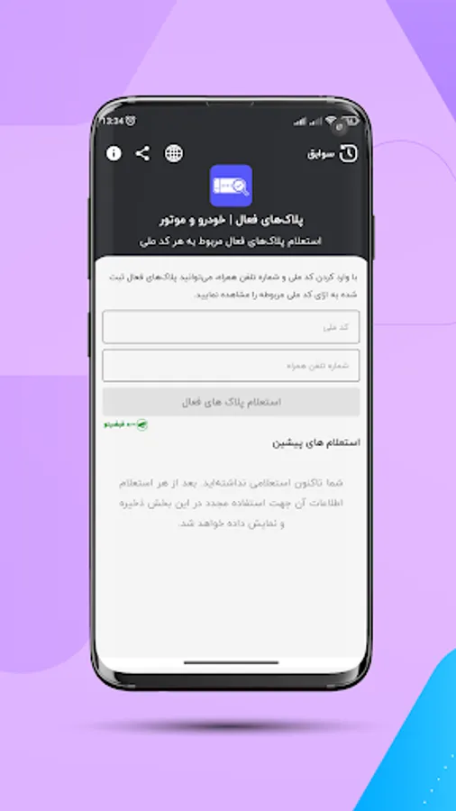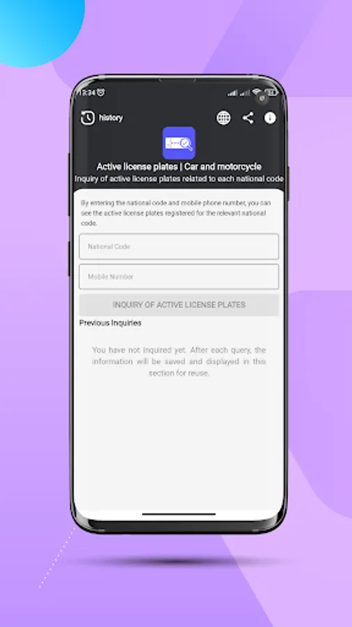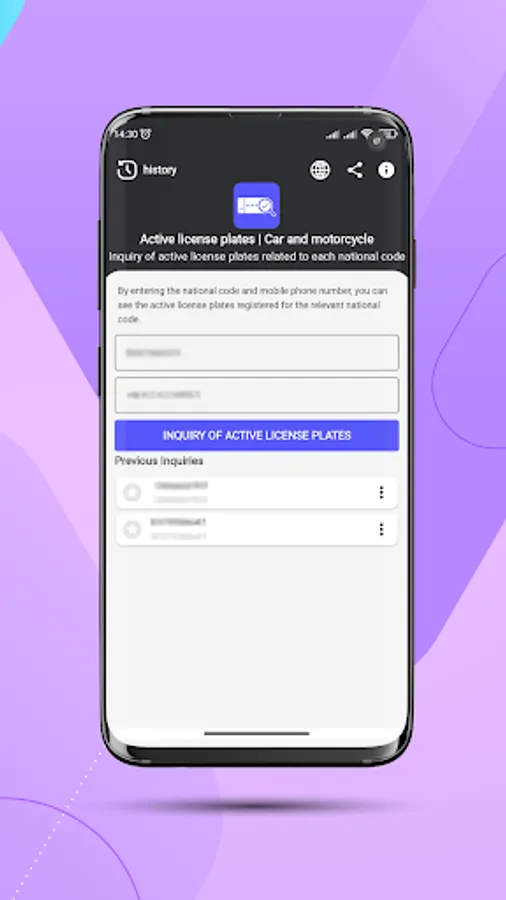 To inquire about active license plates through this application, just enter the national code and mobile phone number in the name of that national code and see the latest status of your active car and motorcycle license plates in full detail.