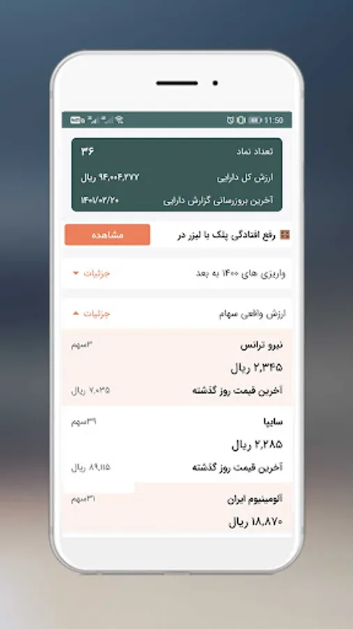 در اپلیکیشن سهام عدالت اطلاعات زیر در بخشهای مختلف به شما نمایش داده میشود: