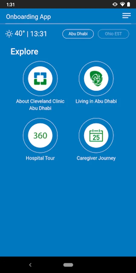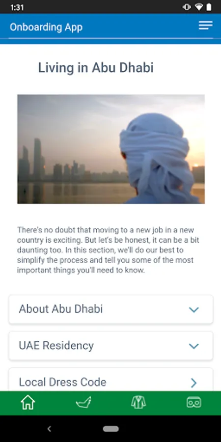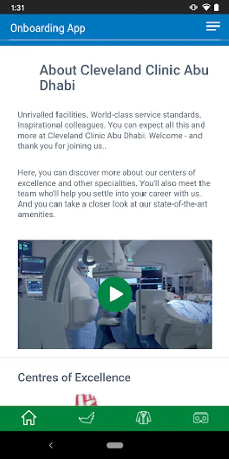 Unrivaled facilities. World class service standards. Inspirational colleagues. You can expect all this and more at Cleveland Clinic Abu Dhabi. Welcome - and thank you for joining us. The app allows you to discover more about our centers of excellence and other specialties. There are virtual tours of the Clinic itself, and of the accommodation. Through the app you'll also meet the team who'll help you settle into your career with us. It also provides information about moving to and living in Abu Dhabi, life outside of work, accommodation and schools.