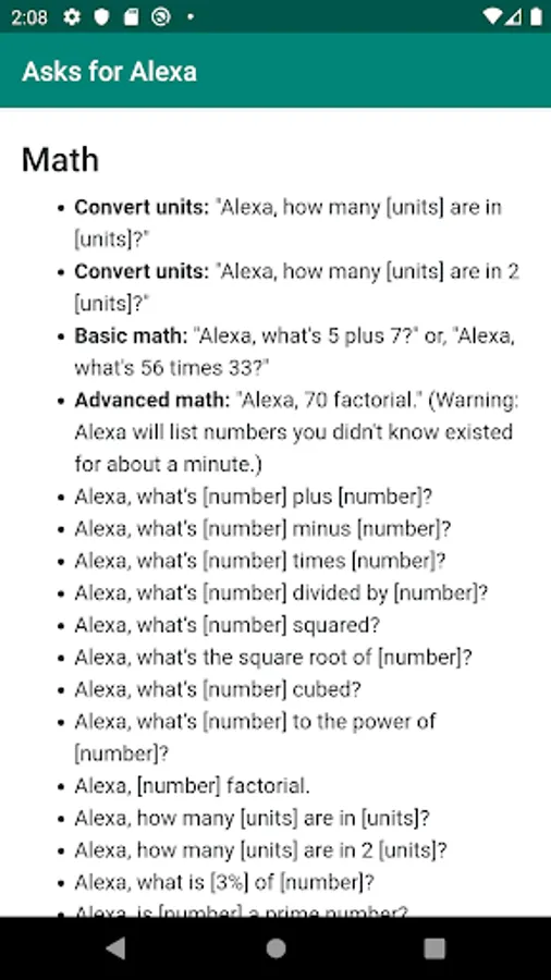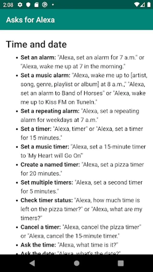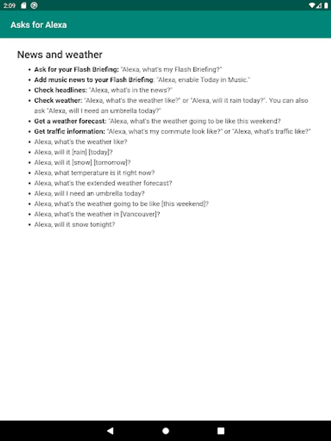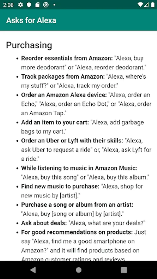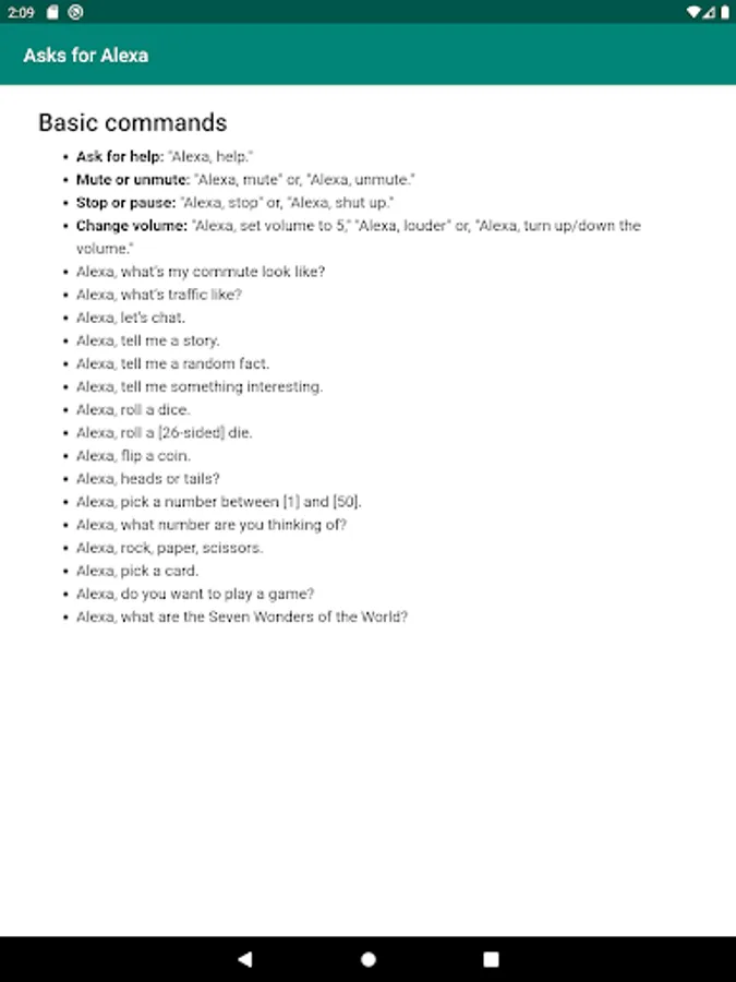 Get all voice commands for Alexa in one place arranged by category. Alexa can do a lot of things like play music, order food, turn on lights, adjust thermostats, lock doors, find TV shows and many more. In this app, you will able to learn everything you need to know to command your Echo Device such as Echo, Echo Dot, Echo Show etc.