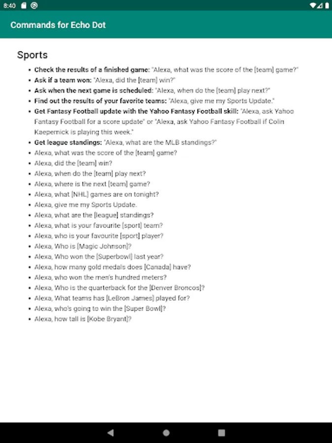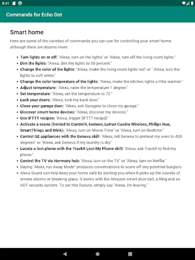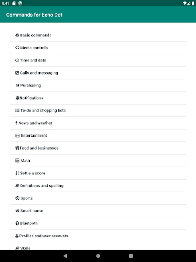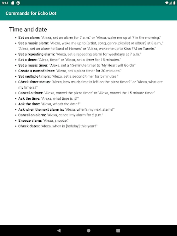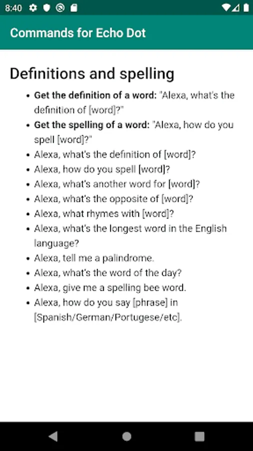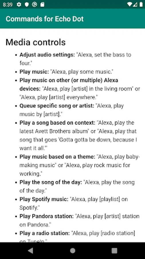 Complete list of Alexa commands for your Amazon Echo Dot device. Echo Dot is a voice-controlled Smart Speaker powered by Alexa. It's smallest Echo Device from Amazon. From this app, you will able to learn anything like play music, news, fun, information, and more voice commands of your Echo Dot device. Like: