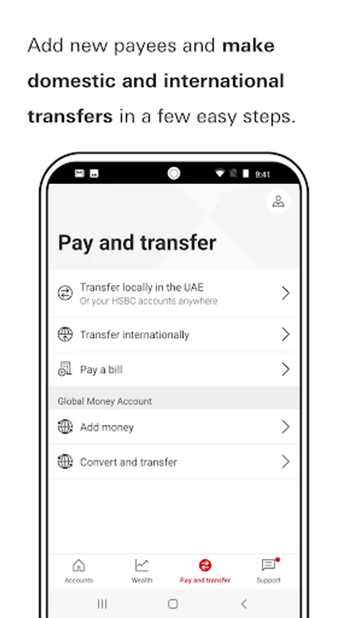 • ‘Pay and Transfer’ – Add new payees and make domestic and international transfers in a few easy steps. Instant transfers to HSBC international accounts without any fee