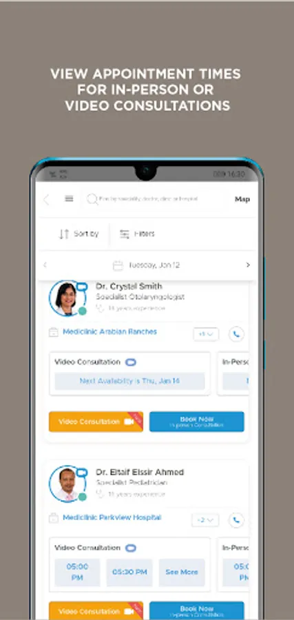 • Search and select doctors by speciality, location, languages spoken, insurance coverage and gender