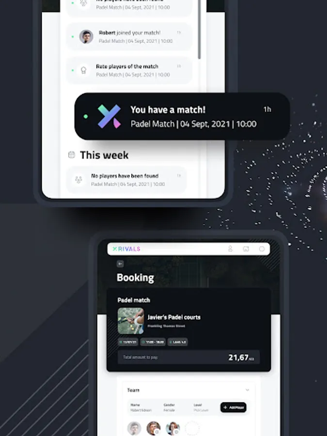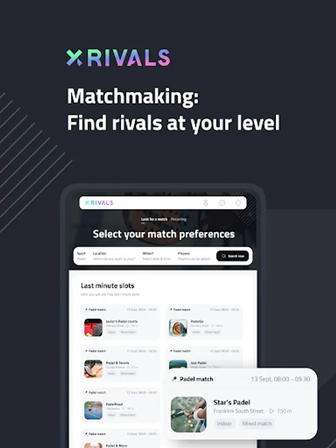 Find players at your level whenever you want, wherever you want and book a court with XRIVALS. You no longer need to rely on the availability of people you usually play with. With a large pool of rivals looking to play games, our algorithm finds the rival closest to your level: