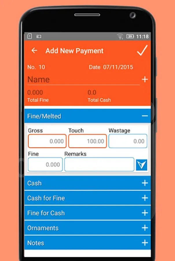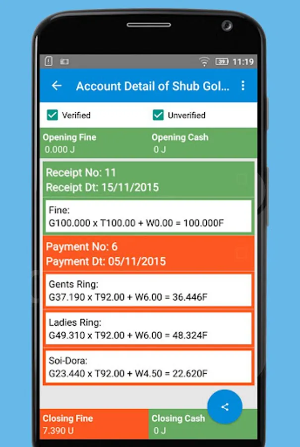 > Payment/Receipt Vouchers for Fine/Melted Gold(Dhal) and Amount.