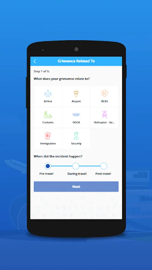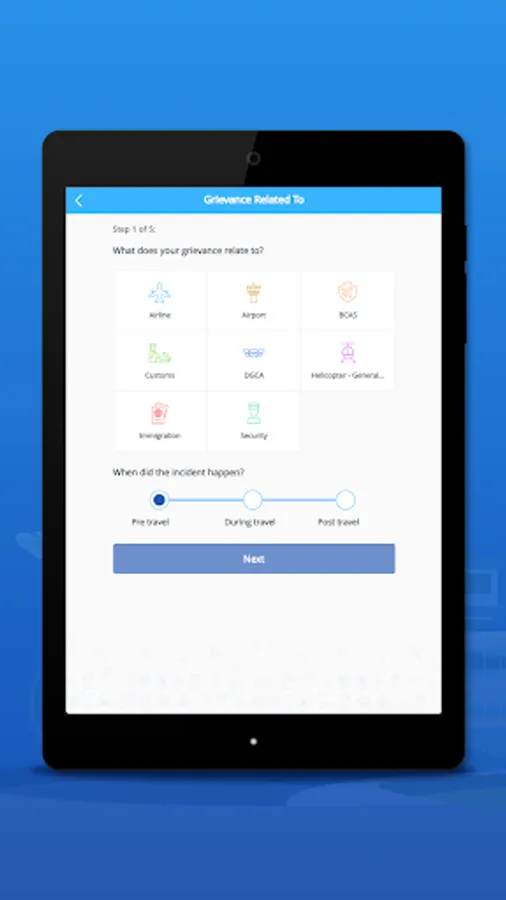 Submit & Track Grievances: User can submit grievances for selected categories (E.g.: Airline, Airport) and track them