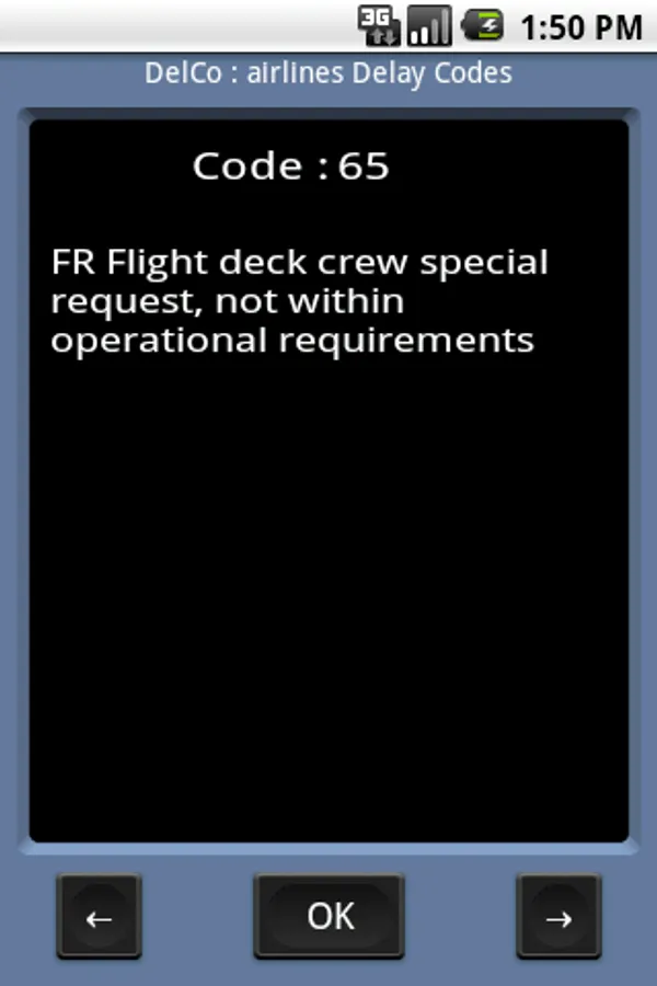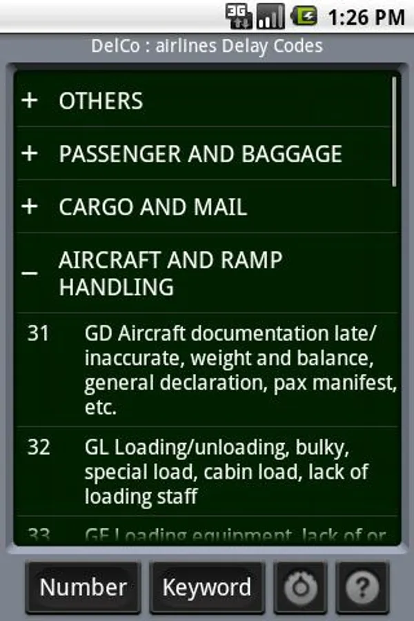 DelCo is an application dealing with airlines delay codes. Crew or staff can find a code's definition after its number, a keyword or by browsing through categories (Ground Ops, Weather, ATC...).