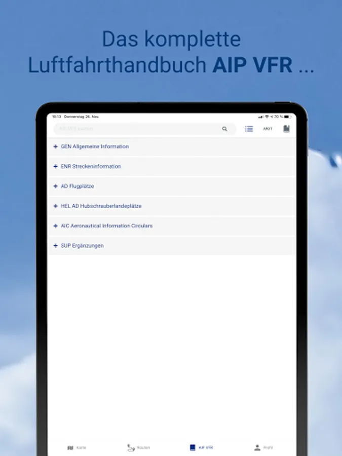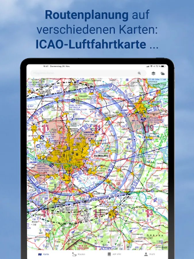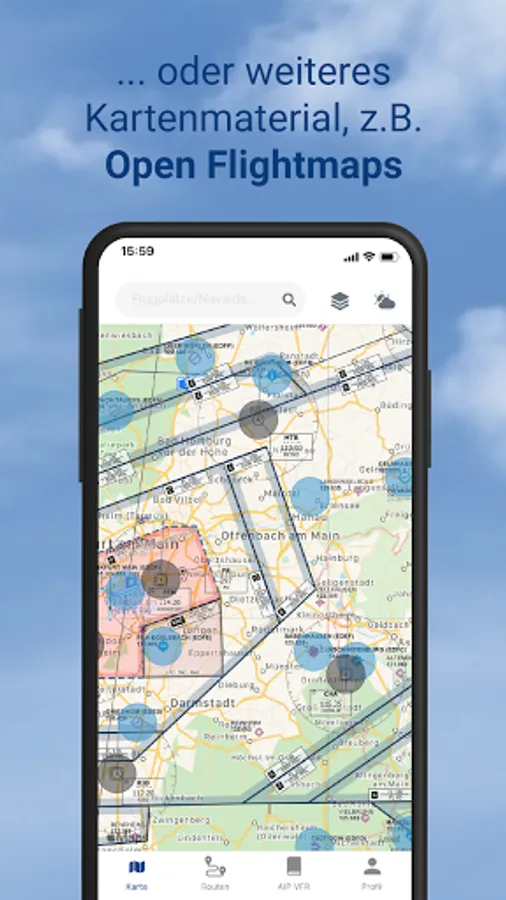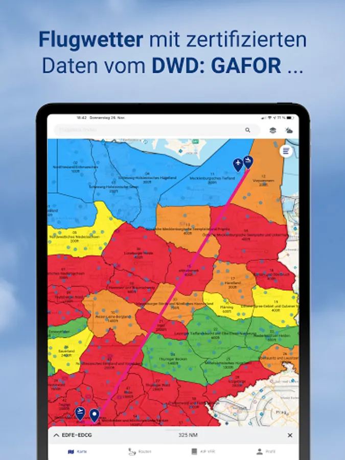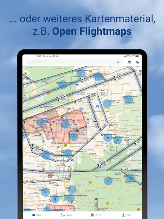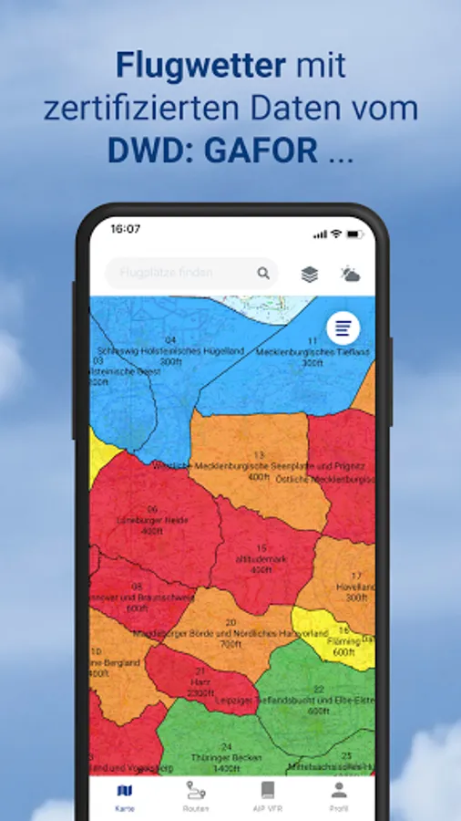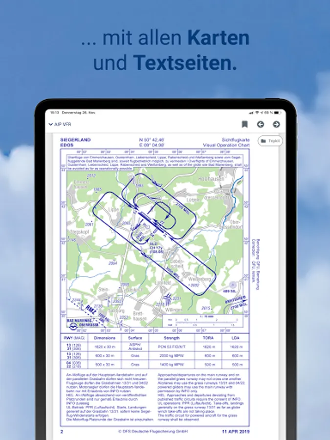 pilotESsentials bundles a lot of information that supports your flight preparation in one place. The app accesses certified current data from DFS Deutsche Flugsicherung and DWD Deutscher Wetterdienst.