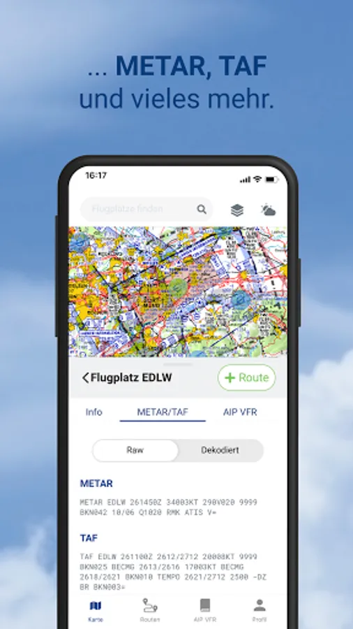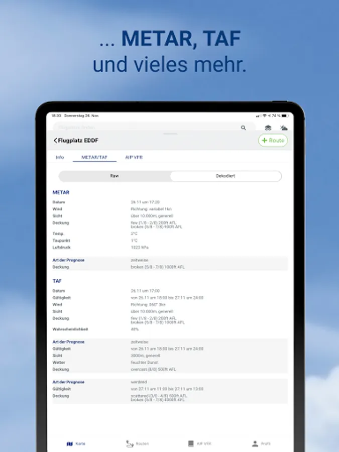 • Display of DWD flight weather data: GAFOR area weather forecast, METAR airport weather forecast and TAF airport weather forecast in coded and decoded form