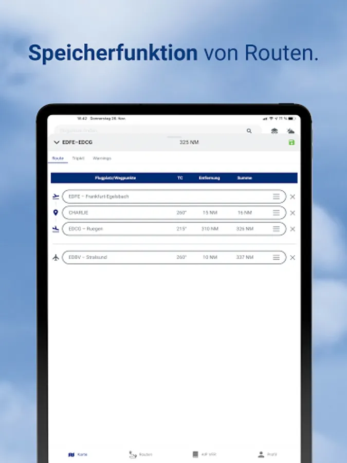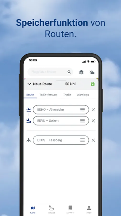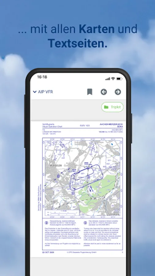 With the TripKit function, all the necessary information from your route planning is summarized: Map excerpts from the Open Street/Flight Map or ICAO map (requirement: in-app purchase of ICAO map), visual flight and airfield maps from the AIP Aviation Handbook VFR for departure and destination airport as well as alternate airfields (alternates) (requirement: in-app purchase Aeronautical Information Manual AIP VFR), weather data and a partly pre-filled flight plan. All data is bundled and saved in a PDF document and is therefore also available offline.