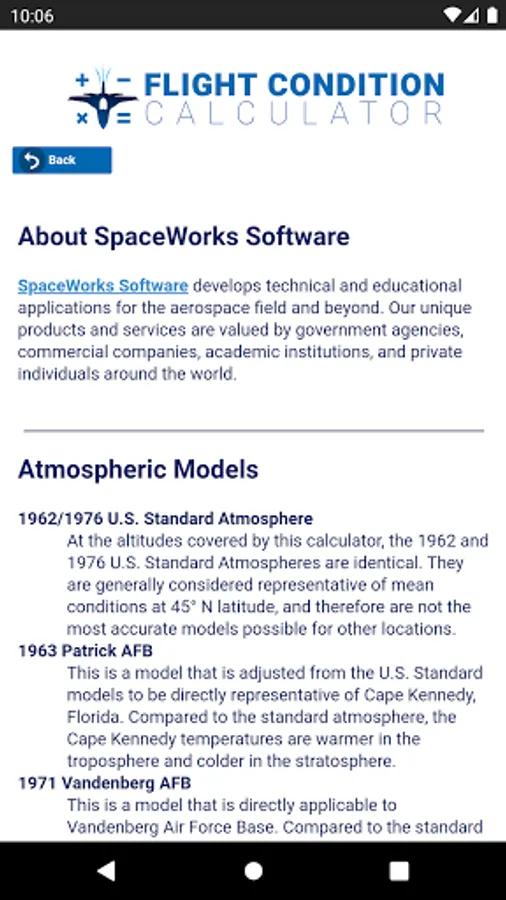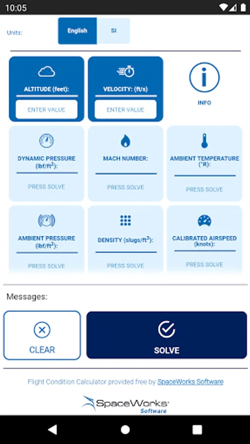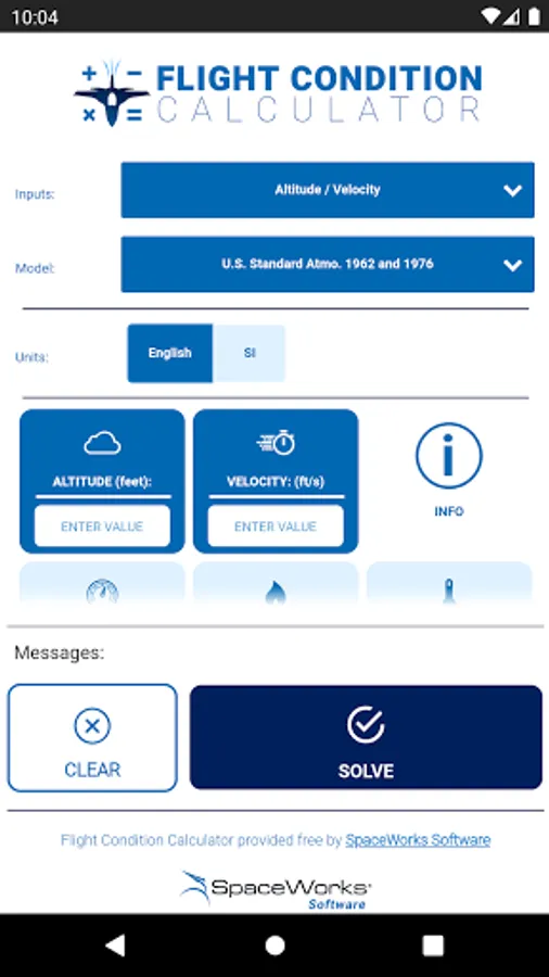 SpaceWorks Software’s new Flight Condition Calculator app is built around a standard set of aerospace equations and definitions, as well as empirical atmospheric data. The app is ideally suited for quick, back-of-the-envelope style calculations, but should never be used in mission critical situations.
