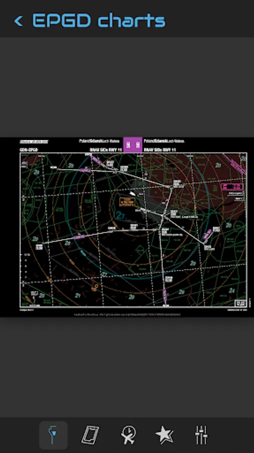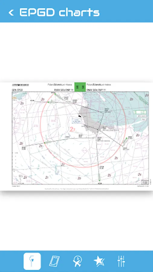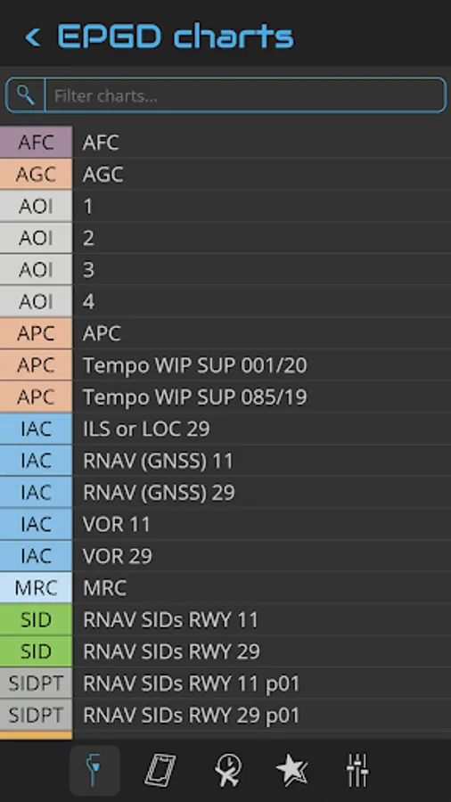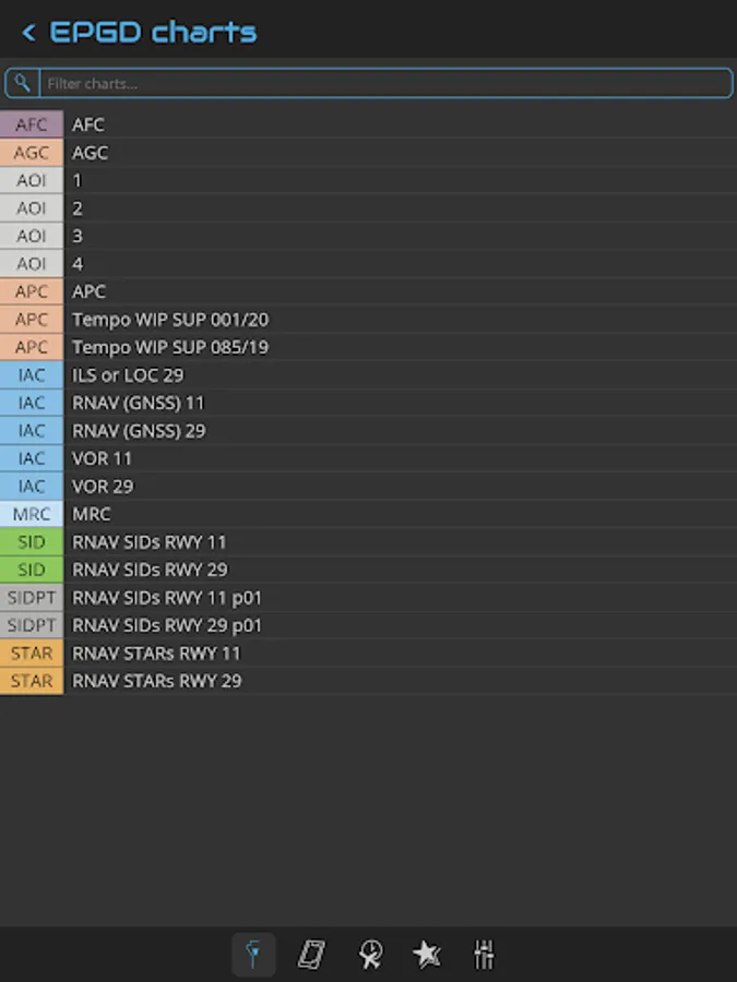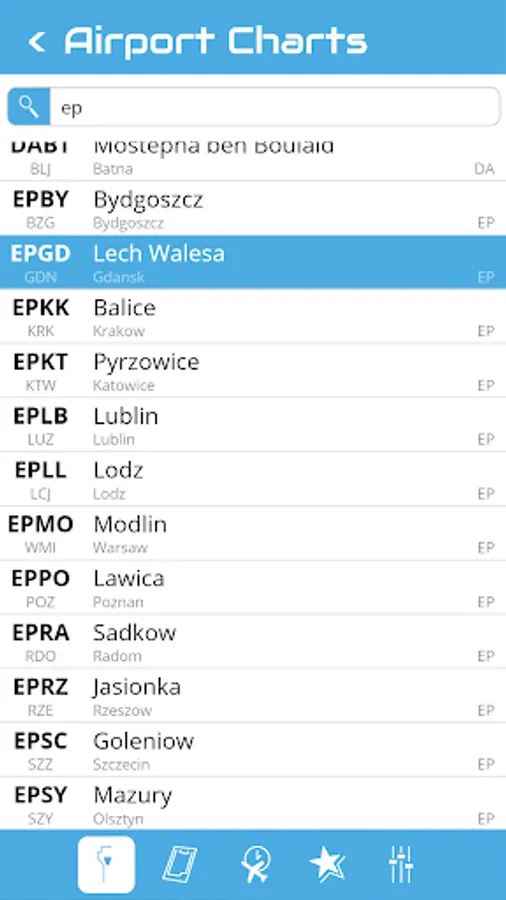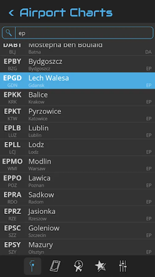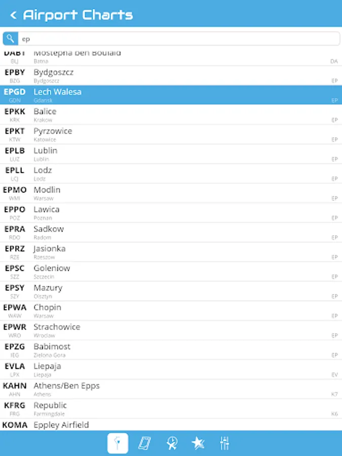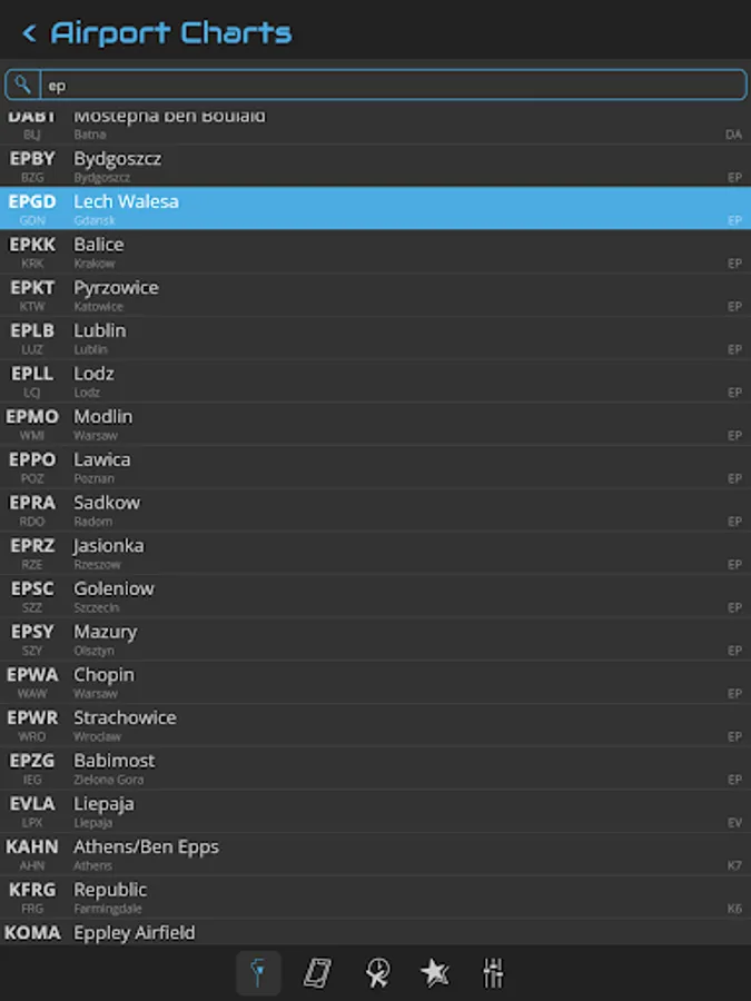 You can search an airport in the airport list. Simply enter your departure, destination and alternate airport in the Quick Flight menu for a quick access to the airport charts. Use the kneeboard feature during your flight to have all needed charts handy.