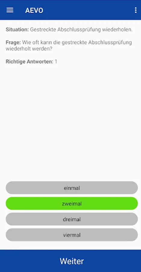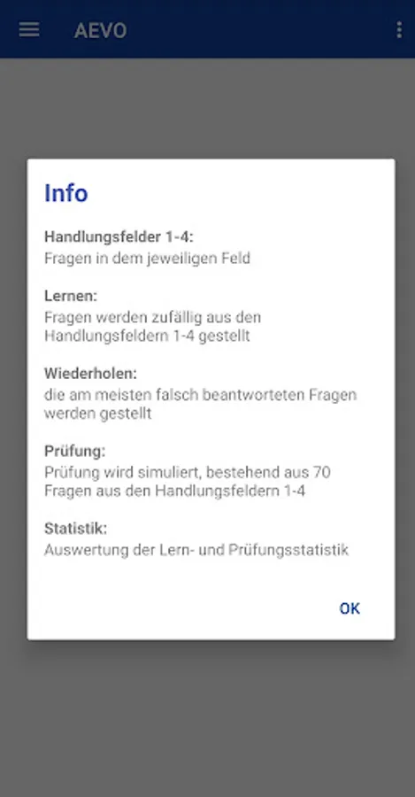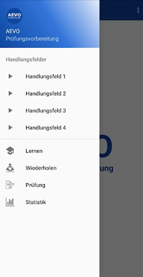 You can learn questions from the respective field of action. The questions are asked in the same order. If you take a break, you will continue with the next question next time. As soon as you have reached the end, you can start again with questions.