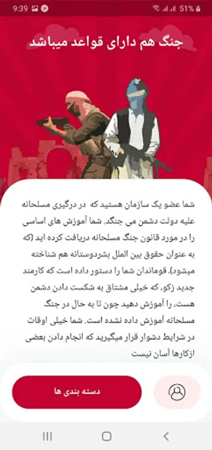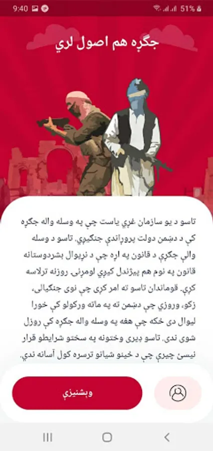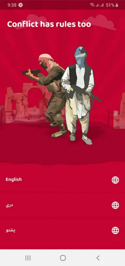 Conflict has rules too - Afghanistan is a trivia app developed by the Geneva Call. It's available in Pashto, Dari and English languages. You get a set of categories, and questions on rules of conflict. You can check your knowledge by taking quizzes and seeing the result at the end.
