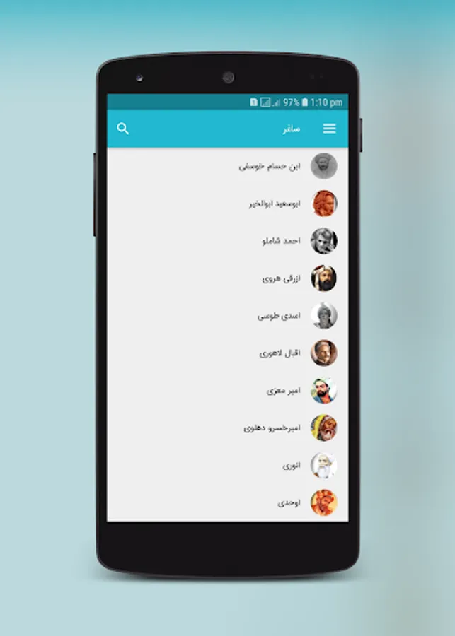 Hafez - Khayyam - Ferdowsi - Rumi - Nezami - Saadi - Parvin Etesami - Attar - Sanai - Wild - Rudaki - Naser Khosrow - Manouchehri - Farrokhi Sistani - Khaghani - Masoud Saad Salman - Anvari - Ouhadi - Khajavi Kermani - Iraqi - Saeb Tabrizi - Sheikh Mahmoud Shabestari - Jami - Hatef Isfahani - Abu Saeed Abolkhair - The Queen of Spring Poets - Babataher - Mohtasham Kashani - Sheikh Baha'i - Seif Ferghani - Foroughi Bastami - Obaid Zakani - Amir Khosrow Dehlavi - Shahriar - Abdul Wase Jebli - Fakhreddin Saadash Gorgani - Iqbal Lahori - Bidel Dehlavi - Qaani - Kasaei - Ordinary - Raziauddin Artimani - Khalilullah Khalili - Nasrullah Munshi - Hilali Jaghtai - Shah Nematullah Vali - Asadi Tousi - Hojviri - Mahasti Ganjavi - Shater Abbas Saboohi - Baba Afzal Oman Samani - Fayez - Ansari - Azraghi Heravi - Amir Moezi - Hakim Nizari - Saad al-Din Varavini - Kamal al-Din Ismail - Zahir Faryabi - Abdul Qader Gilani - Nima Yoshij - Ahmad Shamloo - Sohrab Sepehri - Forough Farrokhzad - Mehdi Akhavan Sales - Bahram Sal