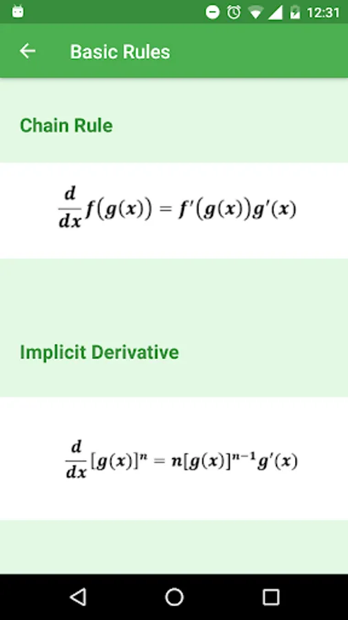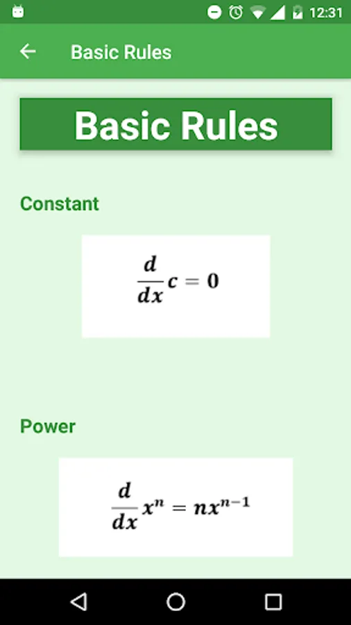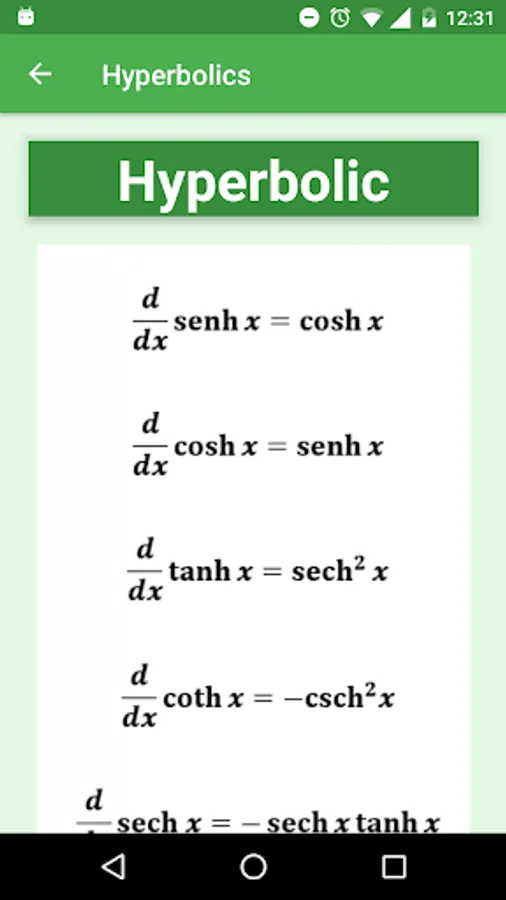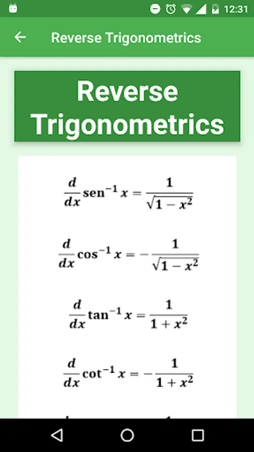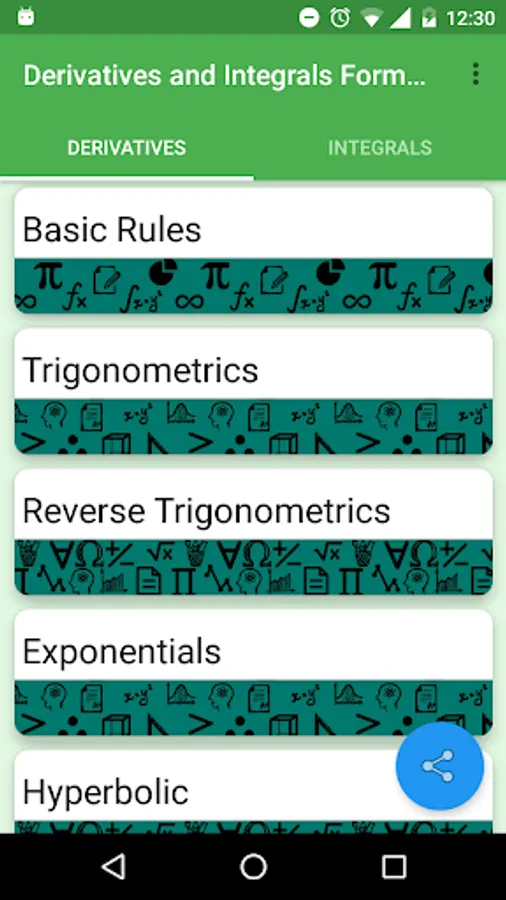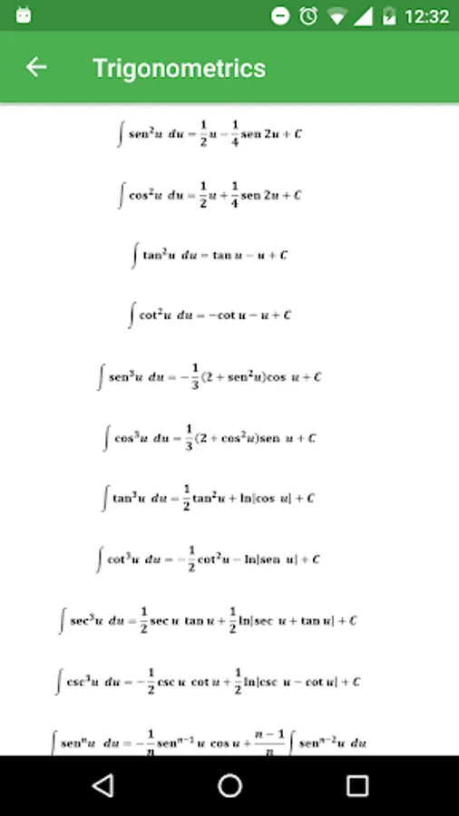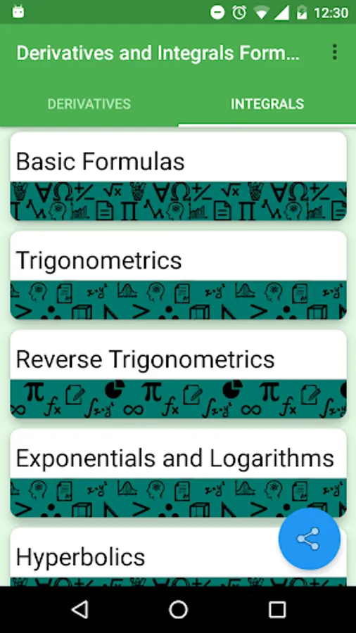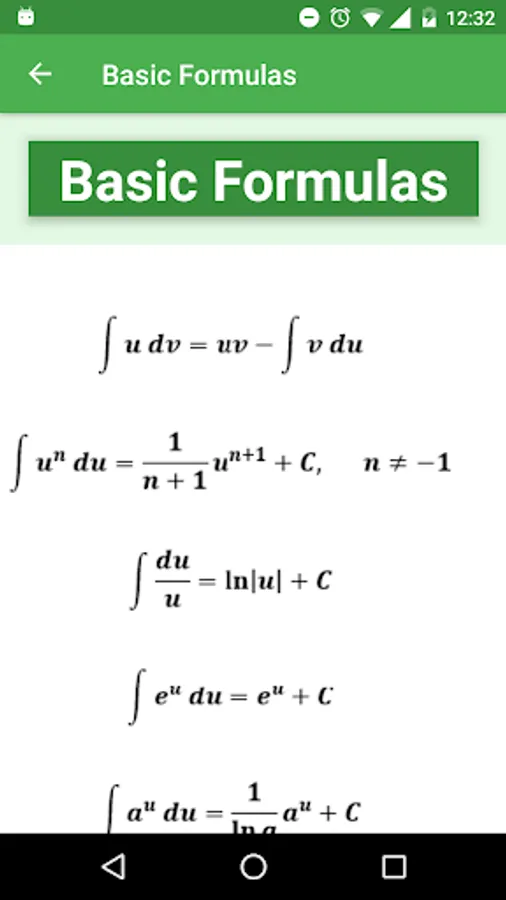 Derivative - Integral Formulas will allow you to have on hand a complete form of all the derivates and integrals that we most use in our classes, while we study at home or while we do practice excercises with our friends. Do not need Internet connection, so it always will be available in the most required moments.
