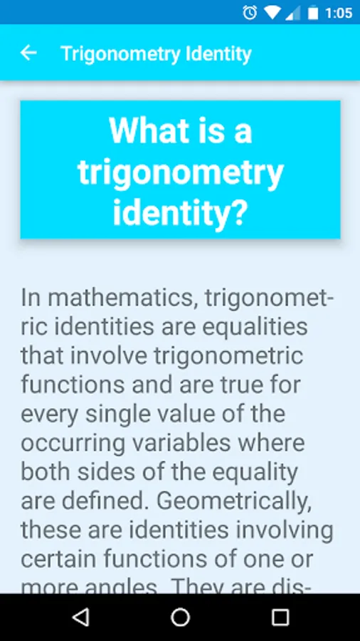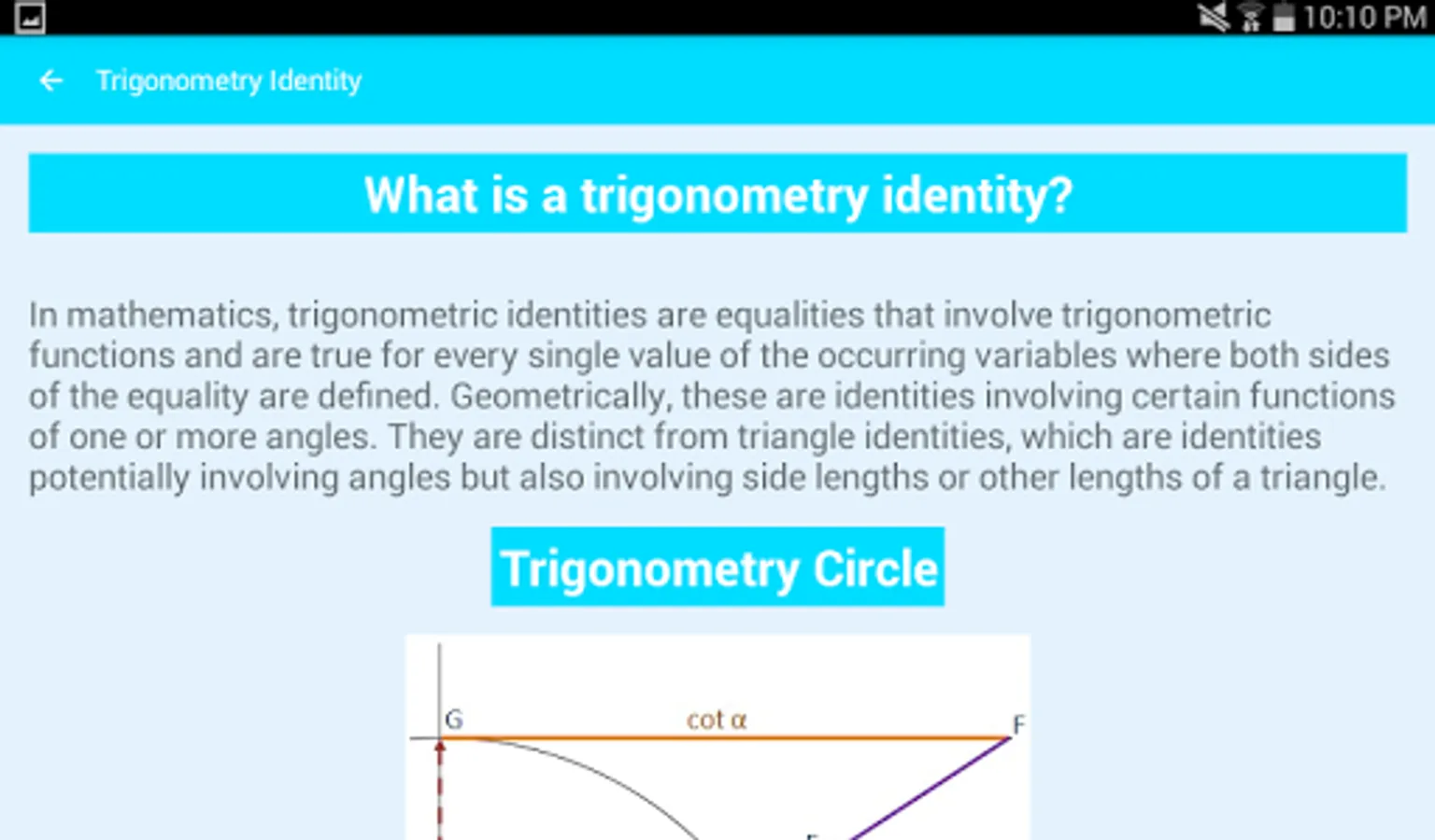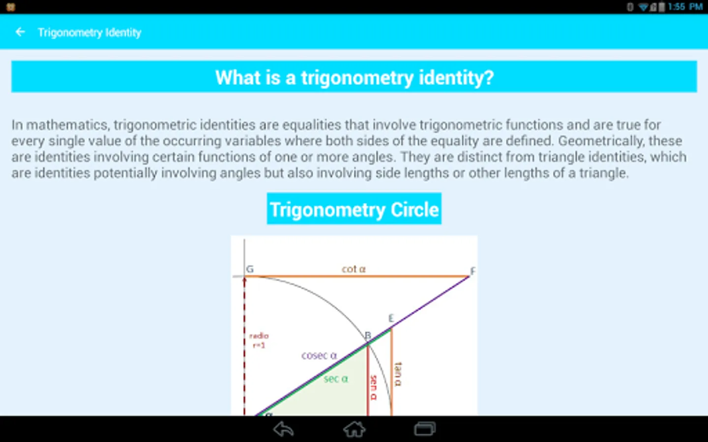 Trigonometric Identities will allow you to remember quickly the most common trigonometric identities that we use in maths and related studies like calculus or algebra.