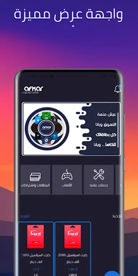 تسوق بطاقات شحن اونلاين والاشتراكات الترفيهية وخدمات عامة الكترونية
