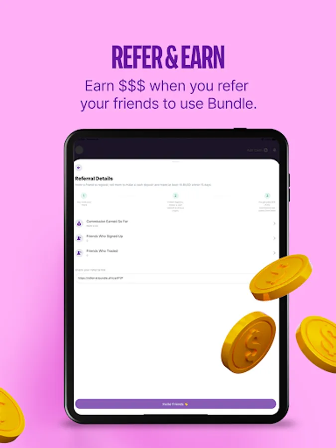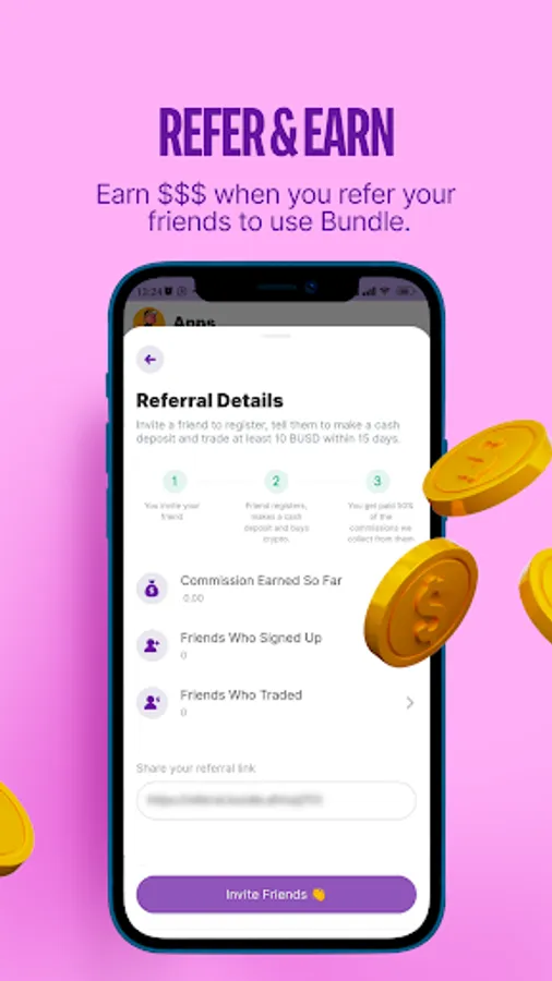 Share your Bundle referral link and earn a commission for each friend who joins Bundle through your link and trades the minimum amount required within 15 days of joining.