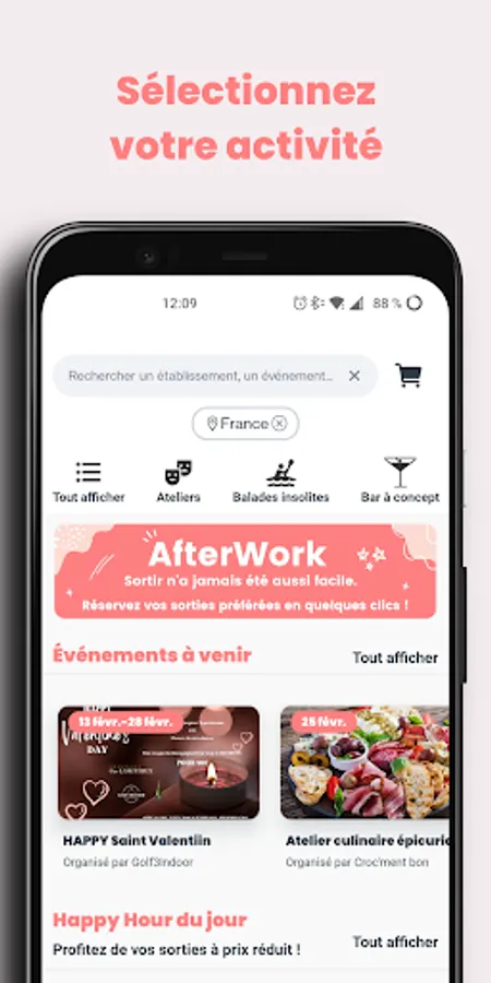 The AfterWork application allows you to find all the activities of your city in the same place and to book them at the same price as on site!