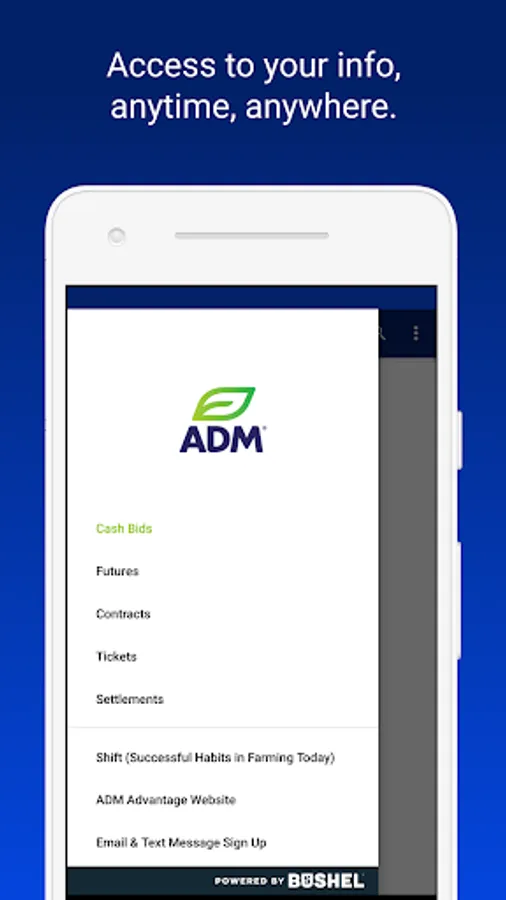 The ADM FarmView app is free, secure, and developed by the industry-leading Bushel platform.