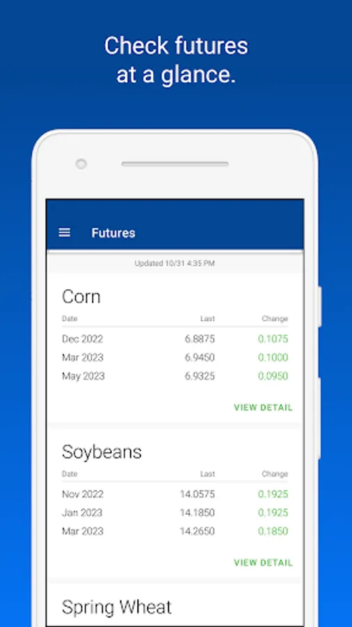 Futures: See Grains, Feed, Livestock, and Ethanol futures listed in order of your preference