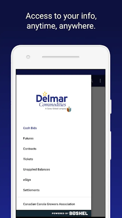 The Delmar Commodities app is free, secure, and developed by the industry-leading Bushel platform.
