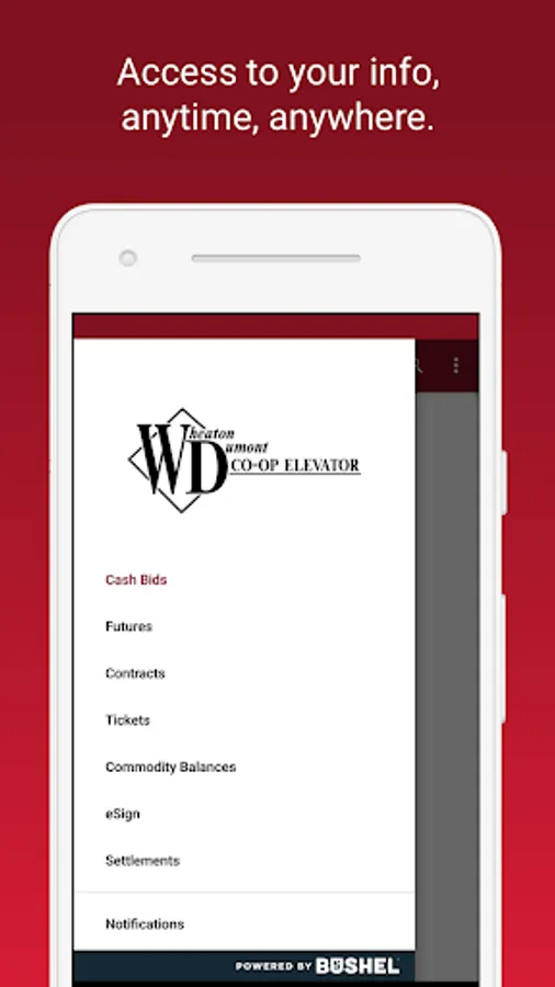 The Wheaton Dumont Coop Elevator app is free, secure, and developed by the industry-leading Bushel platform.