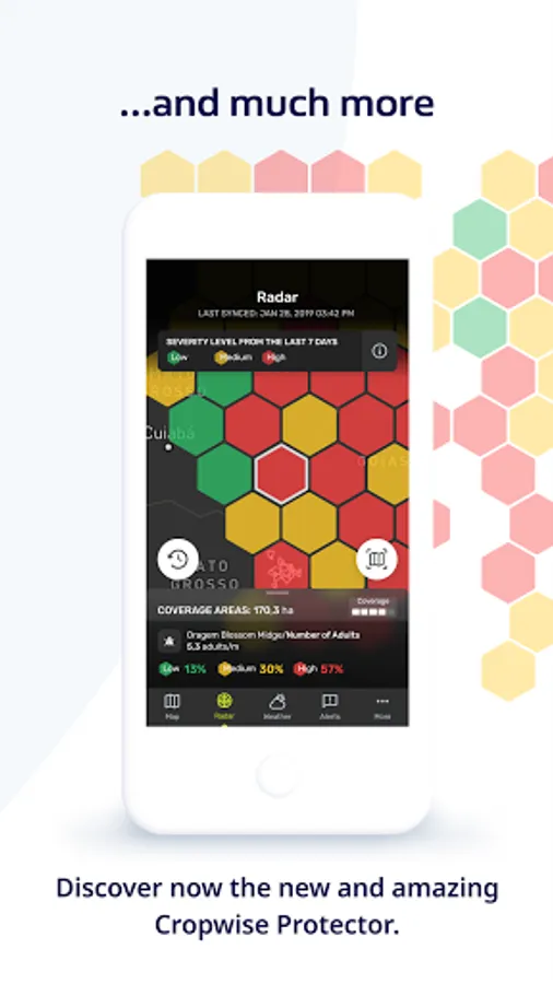 With Cropwise Protector, the grower has access to the most important agronomic indicators, via cell phone. With powerful analysis and visual panels, the information collected is always accessible to the grower for faster and more accurate decision making - all organized in graphs and maps that provide the general and detailed view of the pest pressure, crop evolution, team activities, library of maps, weather data, etc.
