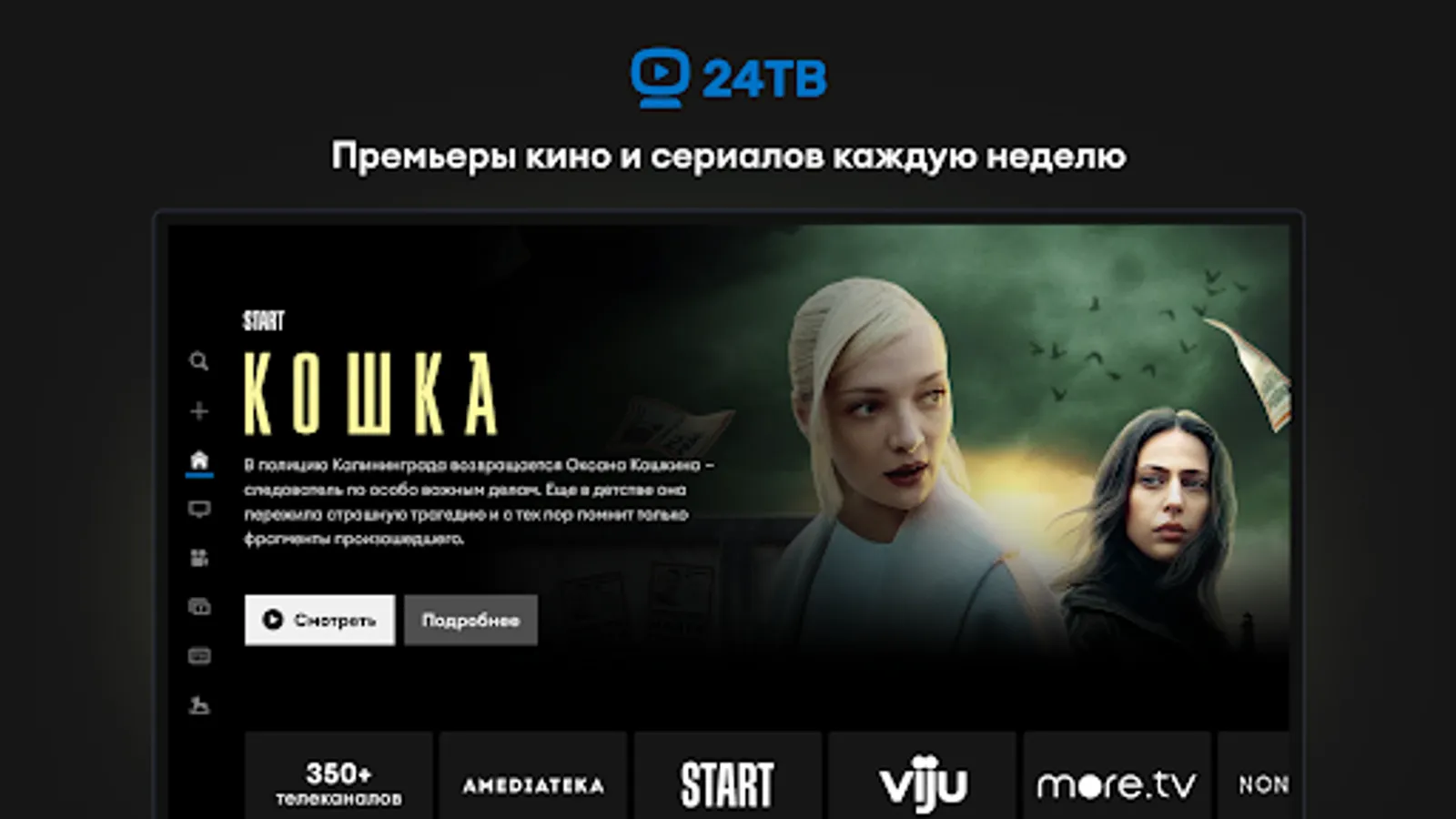 24TV is more than 350 TV channels and 5 online cinemas in one application. Watch movies and series in HD quality at START, Amediateka, more.tv, viju, Nonfiction.film cinemas, live and recorded on your favorite channels.
