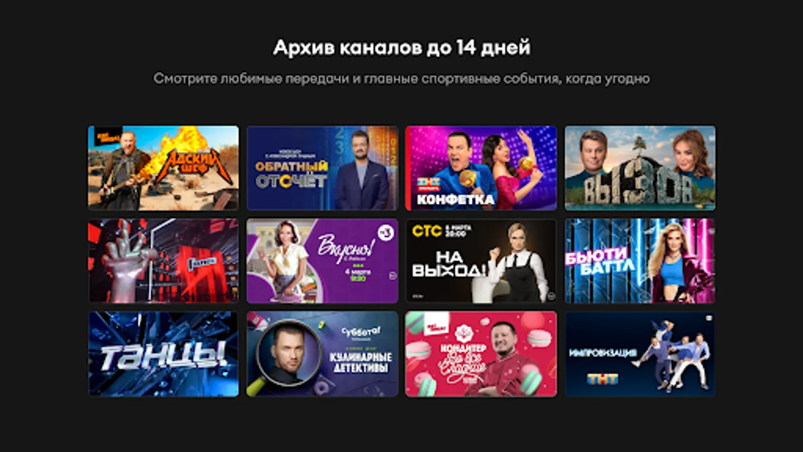 • More than 350 channels: Channel One, TNT, STS, TVC, Karusel, Match TV, STS kids, Disney, 1TV HD and hundreds of others. Built-in 7 days program guide and free digital channels.