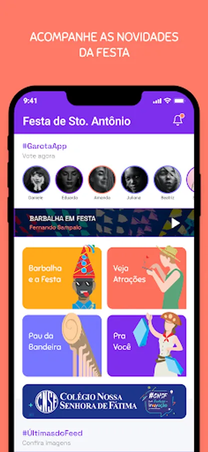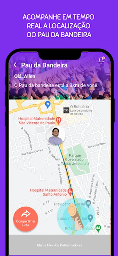 + Track Flag Tracking: a function created so that on the day of the procession app users can know in real time the location of the main symbol of the event that is the Pau da Bandeira de Santo Antônio.