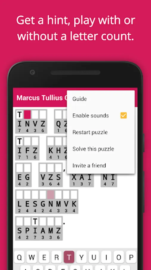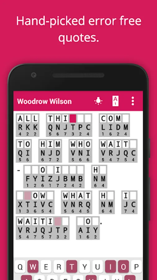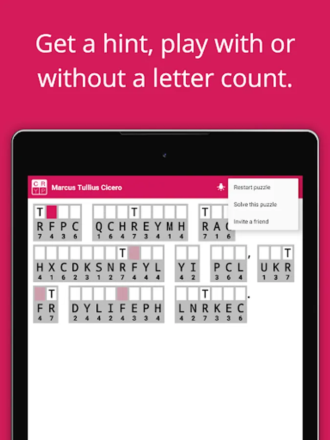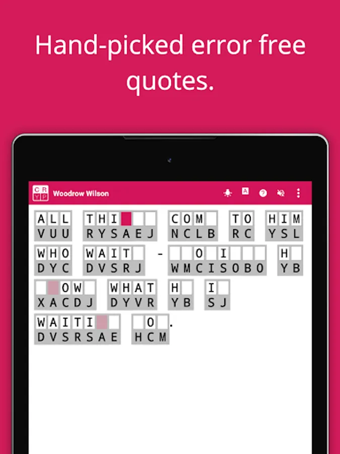 The best app for serious cryptogram / cryptoquip solvers. Designed from scratch for fast quality play, this cryptogram app allows you to concentrate on solving the puzzle. The quotes are hand-curated and carefully validated to be error free. The result is pure puzzle solving fun with no typos, ads or distractions!