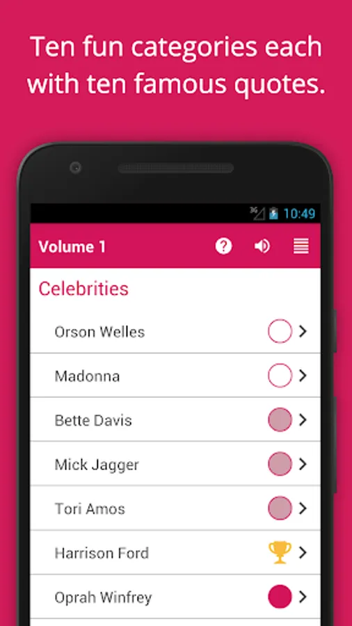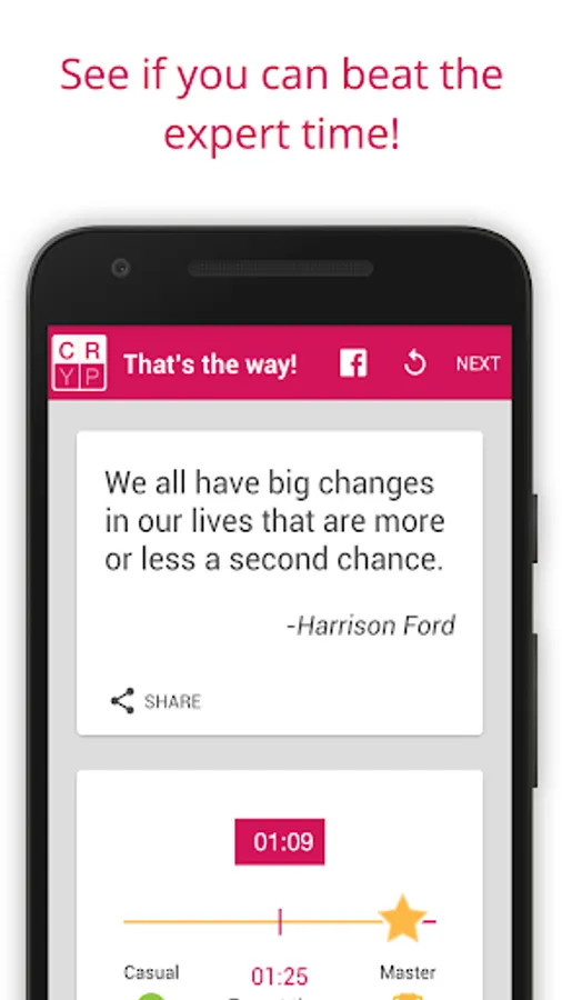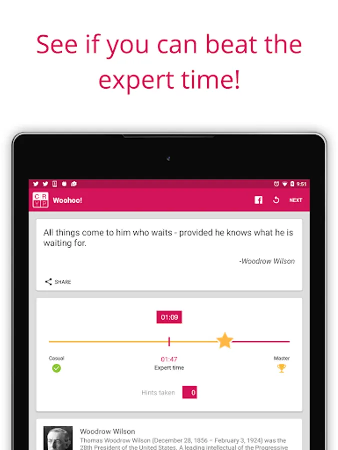 The one hundred hand-picked cryptogram puzzles are organized into ten popular categories like Ancient Wisdom, Celebrities, Comedy, Philosophy, Politicians and Sports. When you finish the puzzle, you'll see how your time compares to expert cryptogram puzzlers and the number of hints taken if any. There is also a short description of the author and a link to find more information.