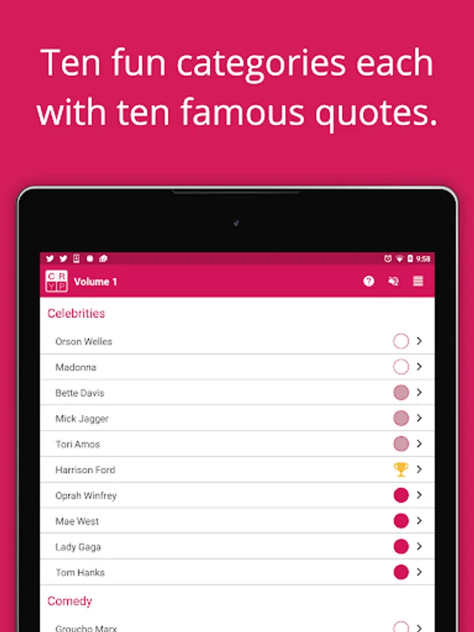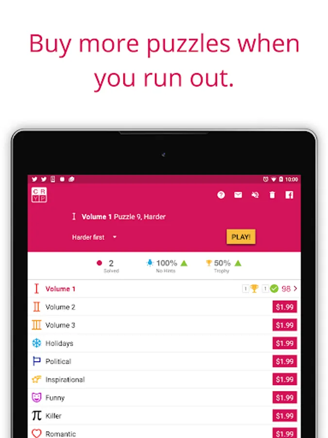Nine more puzzle packs, each with 100 puzzles in various themes like Funny, Inspirational and Killer cryptograms are available for in-app purchase. These will provide HOURS and HOURS of fun!