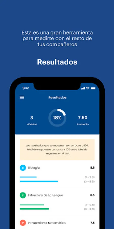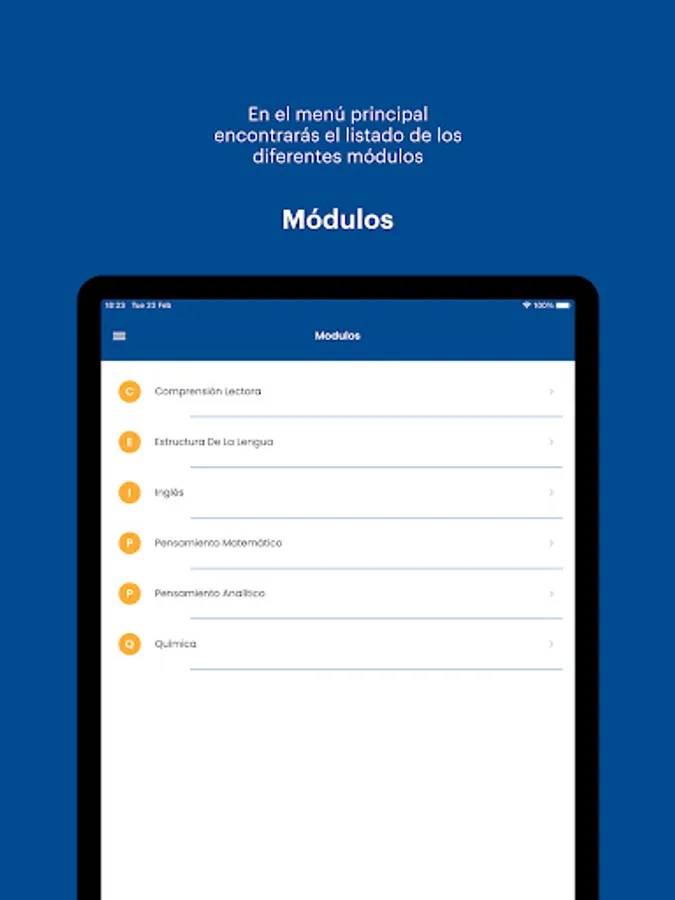 This simulator has more than 1,900 questions that are divided into 7 modules: Mathematical Thinking, Analytical Thinking, Language Structure, Reading Comprehension, Biology, Chemistry and English; with a format similar to the entrance exam for the different schools and faculties of the health field, in order for you to obtain useful knowledge for your exam.