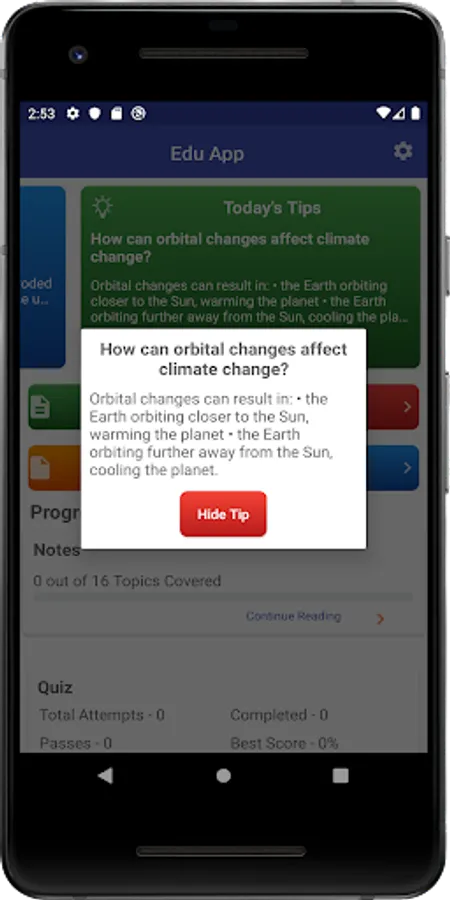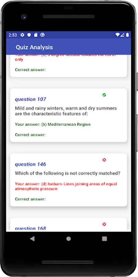 The practice quiz picks random questions from a pool and also has in app marking and score tracking.