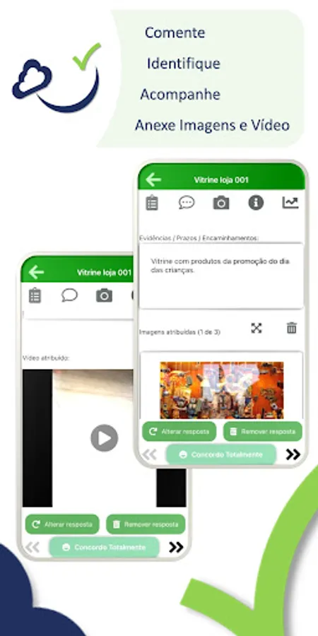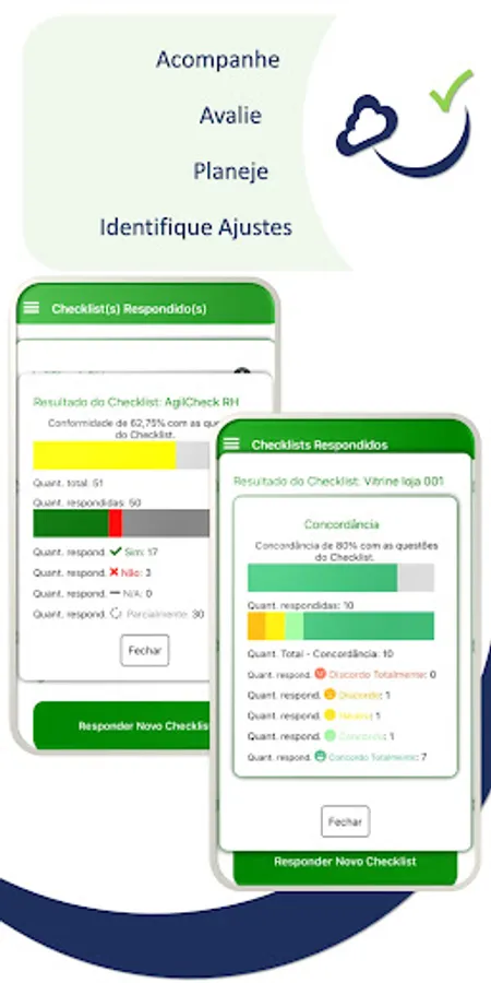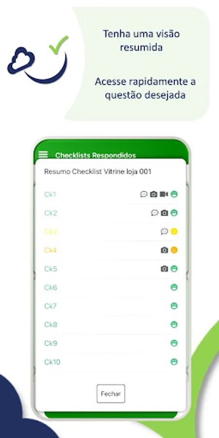 - In each checklist it is possible to inform, comment, identify, attach images and video, evaluate, plan, identify adjustments, quickly access the desired question, follow the completion and have a summarized view;