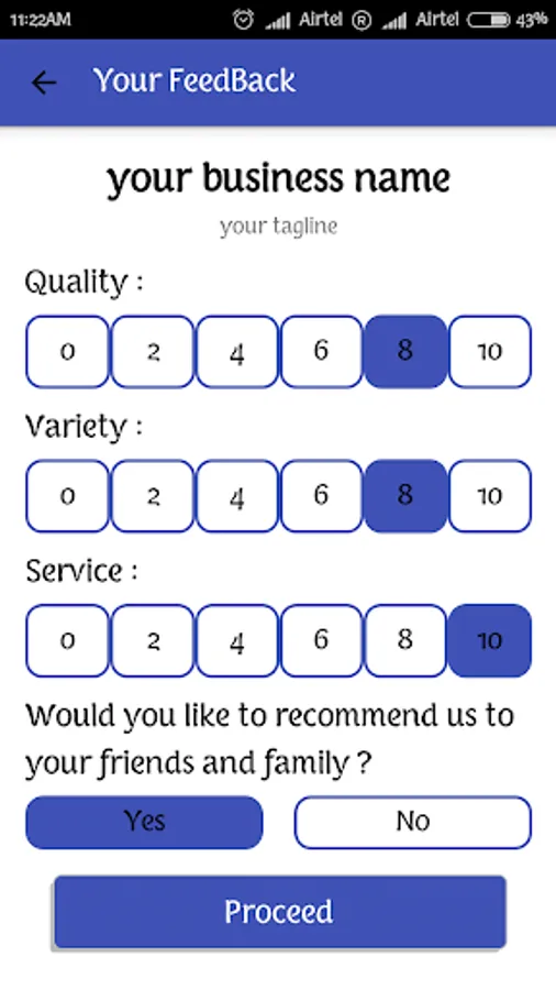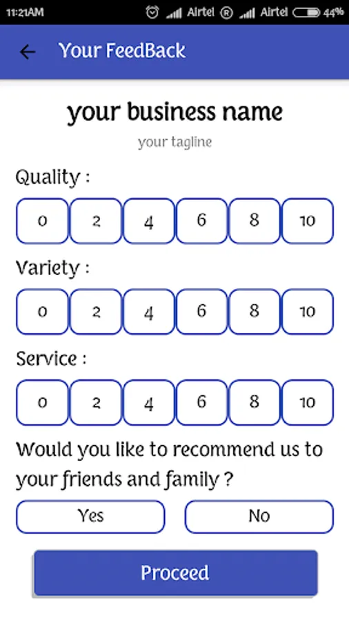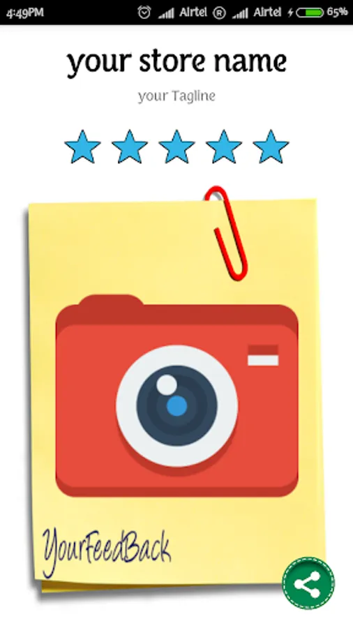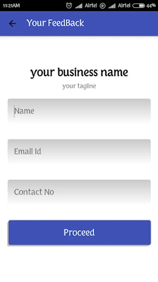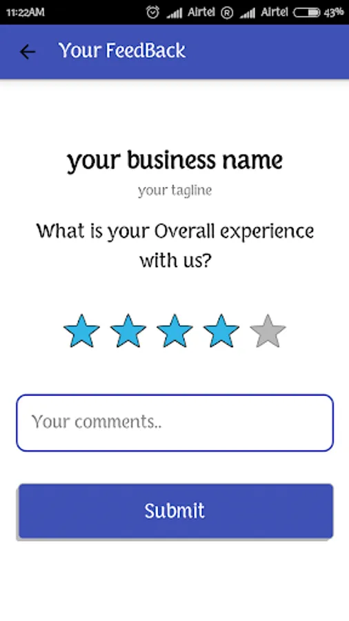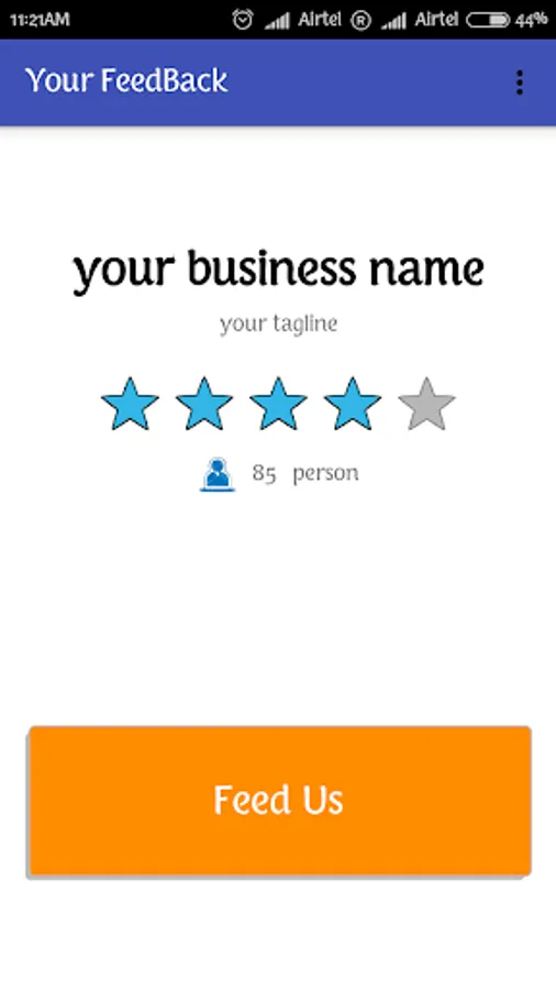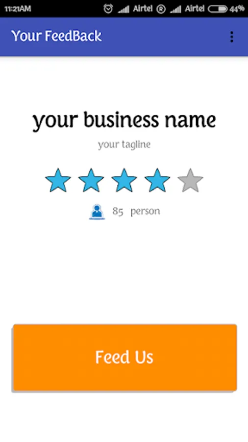 To get an extra charm to your business here we presenting a feedback app which can be installed in any android device. It can be a new way and a better experience to take feedback from the customer. It will store the feedback on your own device to do monitoring of your business, simply pull out your android device and ask customer to give feedback on "Your Feedback App". you can also ask him/her to share the rating for you on Facebook / Twitter / WhatsApp.