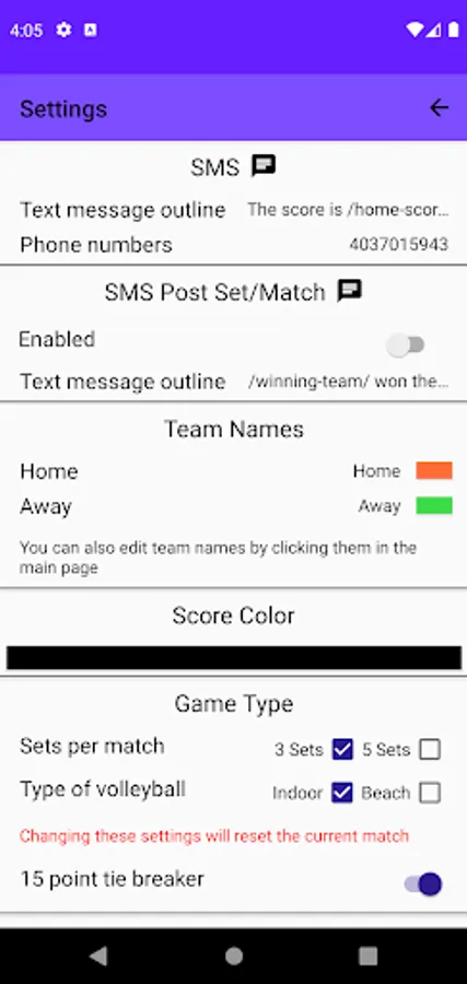 ...Text the score of the game using SMS. You can change the message outline in settings, so you can send a text with variables like scores, set number and more already in the message where you want. Texts can be sent right away using the message outline or you can