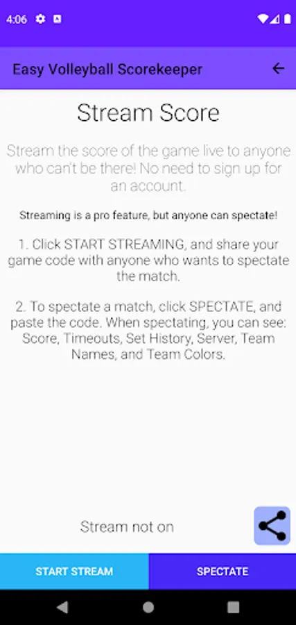 ... Stream the match. This feature allows you to start a stream sharing score, timeouts, and everything else! Share your stream code with everyone who can't be there, and let them keep up to date in real time!