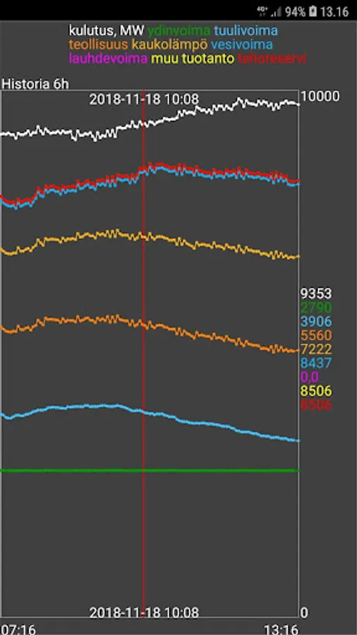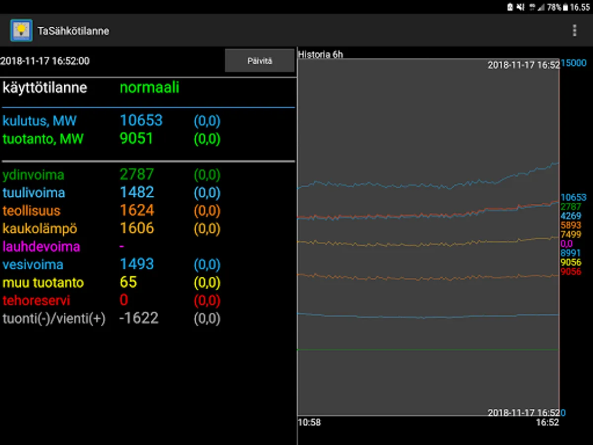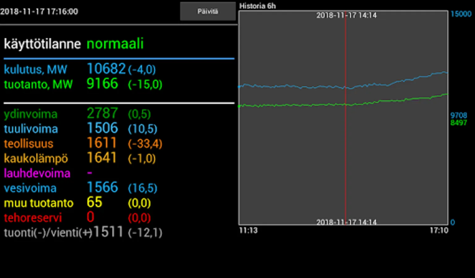 The application shows the latest electricity consumption and production levels in Finland and a 6-hour history.