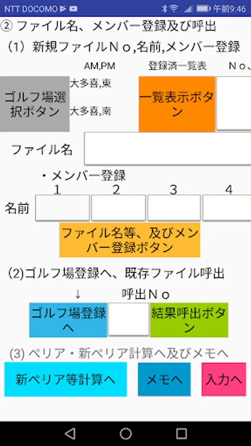 画面 2 screen Golf course registration, file name, member registration, past result call, and button to calculation screen such as new peria