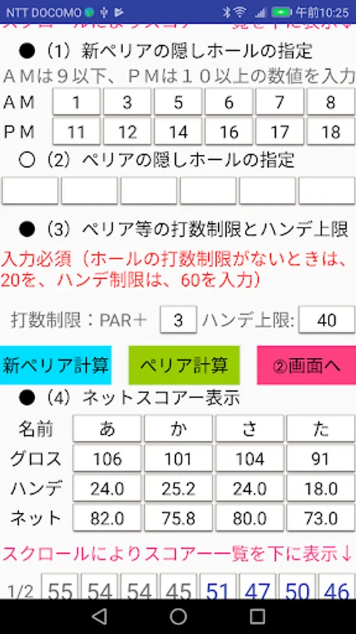 ・ Please enter all 18 holes. (If there is an empty hole, it doesn't work well. You can enter as many as 18 holes, and make one game unit in 18 holes. If you do not enter 18 holes, enter the following file. , Trouble occurs, then call the previous file, enter the 18-hole score will cure.)