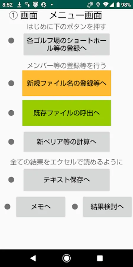 ・ Please enter all 18 holes. (● It doesn't work well if there are empty holes. You can enter 18 holes even if you are alone, and make one game unit in units of 18 holes. If you enter the following file without inputting 18 holes , A problem will occur. In that case, call the previous file and enter the 18-hole score to fix it.)