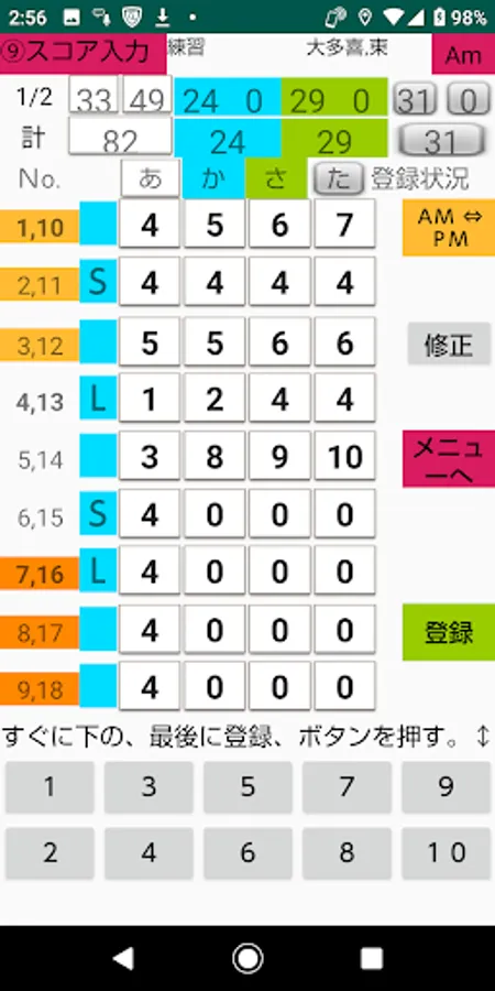 -Although the red input vertical line does not appear, you can input the score continuously, so press the buttons 1 to 15 below corresponding to the score. (For 11 to 15, scroll down. For 15 and above, tap that point to bring up the input board and enter.) Then, press the green "Register" button on the right side. When registered, "●" is displayed in the registration status column on the right side. (If you do not press the registration button, the score will not be entered and you will need to enter it again)
